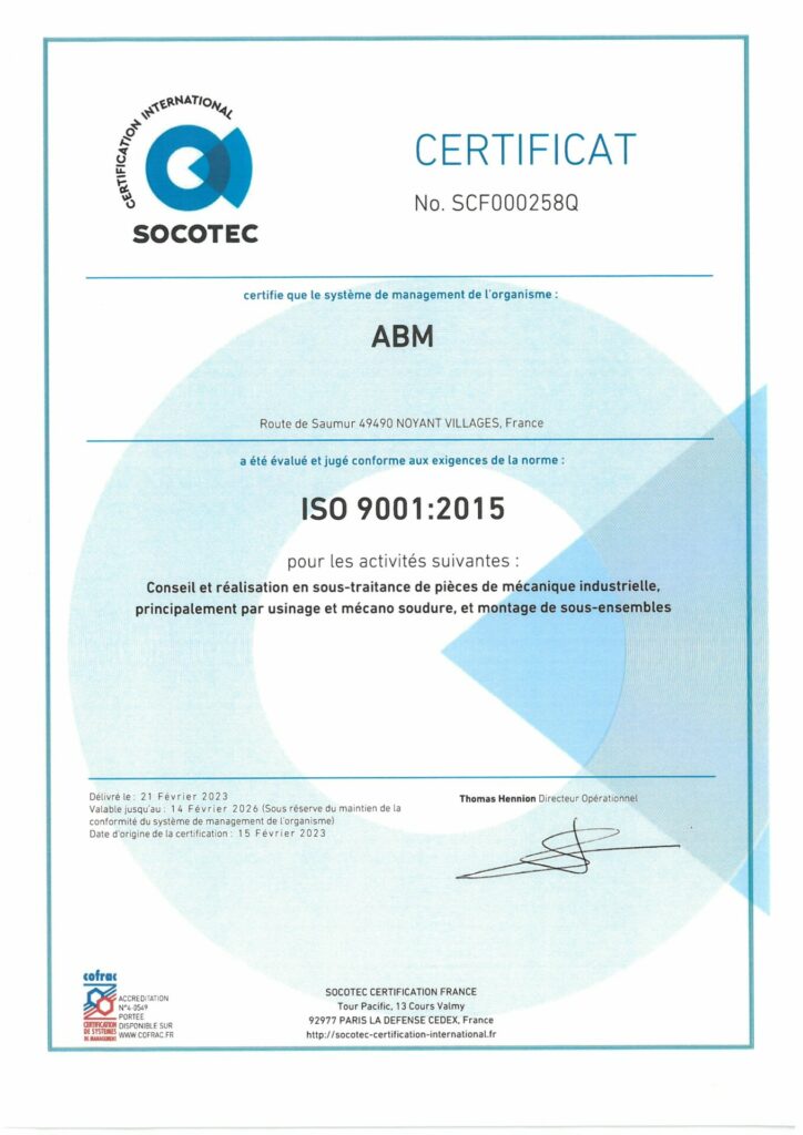 Toutes les équipes d’ABM sont fières de recevoir la certification ISO9001 version 2015